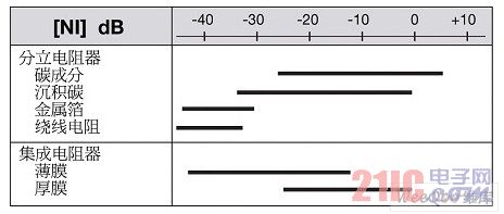 下面圖表顯示了使用不同技術制造的電阻器的噪聲指數。
