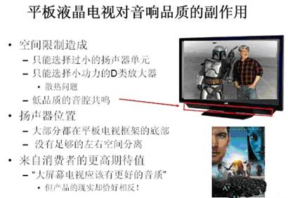 他指出要設計好的電視音響則需要有好的揚聲器單元、大的電視機空間(便于散熱)、更好的揚聲器空間分離(實現雙聲道立體聲效果)、對低頻補償,但是看看現在平板電視,基本是否定了這些要素:例如LCD-TV在采用LED背光后變的更薄、很多液晶電視的音箱放置于電視底端造成空間分離不明顯、由于電視變薄散熱問題加劇廠商把音頻輸出功率降低,所有這一切造成了了一個后果:電視機屏幕越大聽覺體驗越差!