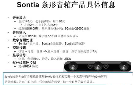 Sontia的業務模型比較有特點,也采用授權模式,主要模式是Sontia授權其3-聲道條形音箱參考設計,Sontia為OEM提供了一個可以直接生產的完整套裝,或者采用預付版權費以及與銷售量有關的版權費模式,Sontia未來的產品走向將向高端條形音箱參考設計、便攜式多媒體播放器的底座(iPod)以及Sontia的數字音頻處理技術直接嵌入到電視里中的軟件解決方案發展。