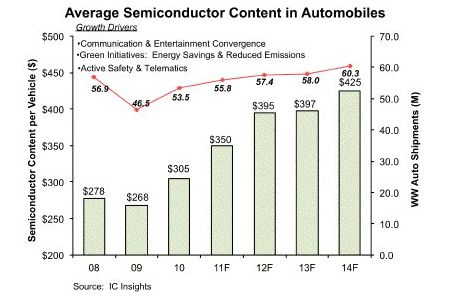 據預計,汽車上裝備的半導體器件份額從2010年到2014年將以年均9%的速度增長,到2014年,平均每輛汽車上安裝的半導體設備的價值將提升到425美元左右。而驅動這種增長的則主要是通信應用,娛樂類應用,安全類應用,遠程控制類應用以及環保類應用。