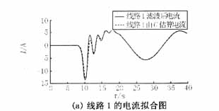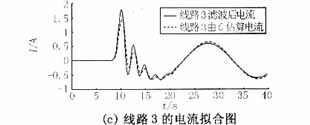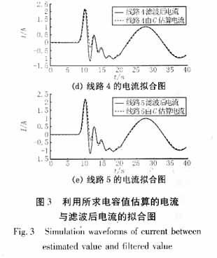 對上述方法用Matlab編程,對仿真數(shù)據(jù)進行分析,求解系統(tǒng)對地電容值。考慮到噪聲污染以及各種隨機干擾的存在,先對故障數(shù)據(jù)進行數(shù)字濾波,將17次以上的諧波去除后再對仿真或?qū)崪y數(shù)據(jù)進行運算。本例所得由電容所計算電流與濾波后電流擬合波形如圖3所示(本文對數(shù)據(jù)濾波時采用的是巴特沃思濾波器,除去9次諧波以上的高次諧波)。