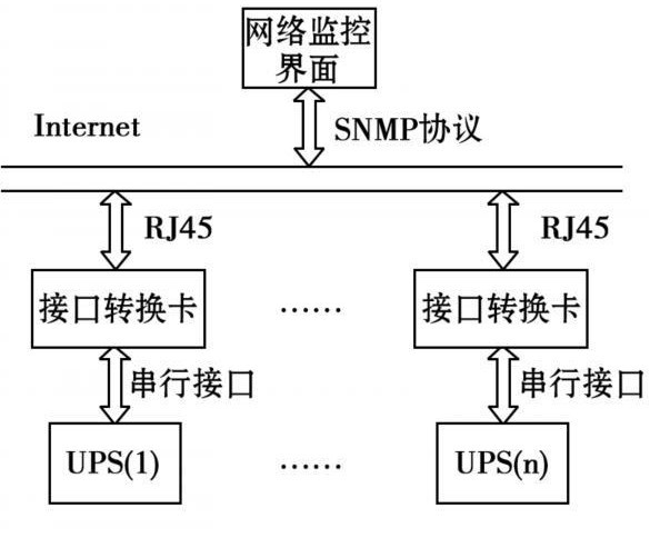 整個(gè)系統(tǒng)的核心為基于SNMP網(wǎng)絡(luò)管理協(xié)議的接口轉(zhuǎn)換卡。接口轉(zhuǎn)換卡一端通過網(wǎng)線與監(jiān)控計(jì)算機(jī)相連,管理人員通過計(jì)算機(jī)可方便地對(duì)其進(jìn)行操作。接口轉(zhuǎn)換卡另一端通過與UPS上的串行接口連接,來獲取UPS工作的各種信息及參數(shù),然后再利用SNMP協(xié)議將接收到的數(shù)據(jù)轉(zhuǎn)換為管理信息庫(MIB)節(jié)點(diǎn)的變量值。管理員通過網(wǎng)絡(luò)管理軟件對(duì)MIB節(jié)點(diǎn)變量進(jìn)行操作,從而獲得各UPS的監(jiān)控信息,實(shí)現(xiàn)了安全可靠的遠(yuǎn)程分散式管理。