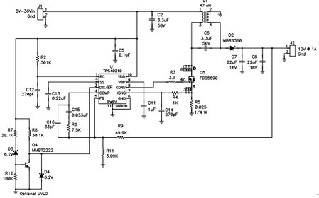 構建起如圖3 所示電路,并對其進行描述。該電路可在汽車市場獲得應用。這里,其擁有一個8V 到36V 的寬范圍輸入,可以為穩(wěn)定12-V 輸出以上或者以下。汽車市場更喜歡使用陶瓷電容器,原因是其寬溫度范圍、長壽命、高紋波電流額定值和高可靠性。結果,耦合電容器(C6) 便為陶瓷的。這就意味著,相比電解電容器,它擁有較高的AC 電壓,同時這種電路會對低漏電感值更加敏感。