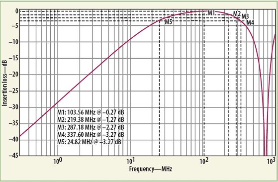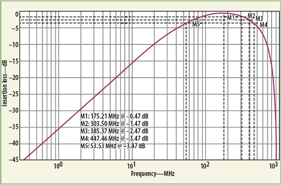 MathWorks的MATLAB數學分析軟件曾被用來分析這種變壓器器件模型的響應。分析中,把單獨的低頻(公式1)響應和高頻(公式5)響應的插損響應結合在了一起。將所需的目標值代入MATLAB公式,可獲得寬帶變壓器的最終響應。為了執行MATLAB模型數值響應的電氣仿真,使用了ADS建模軟件。該軟件有一個很有用的內部源模型,稱為XFERRUTH,其變量參數包括匝數(N)、電感因子(AL)、傳輸線特性阻抗(Z)、傳輸線電氣長度(E),以及計算傳輸線長度所需要的參考頻率(F)。
