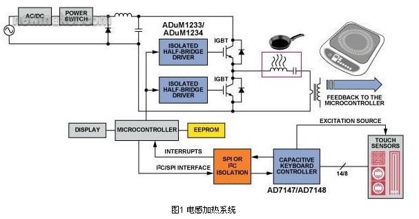 電感元件與變壓器類似,能夠產(chǎn)生磁場(chǎng)。在將金屬鍋置于磁場(chǎng)中時(shí),則會(huì)產(chǎn)生渦電流,電能轉(zhuǎn)換為熱能,通過金屬的熱傳導(dǎo)來加熱食物。由電學(xué)的觀點(diǎn)來看,電感元件驅(qū)動(dòng)有損LC諧振電路,損耗產(chǎn)生了熱量。圖1所示電感加熱系統(tǒng)框圖。