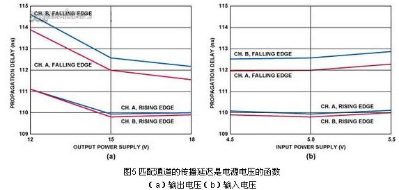 由于兩個(gè)通道之間的定時(shí)關(guān)系是十分重要的,而且PWM信號(hào)在反相階段驅(qū)動(dòng)IGBT,因此與LED和光電二極管相比,iCoupler技術(shù)的速度、穩(wěn)定性和可靠性是非常出色的。如圖5的曲線所示,在輸出電壓范圍為12 V~18 V,輸入電源電壓范圍為4.5 V~5.5 V的情況下,兩個(gè)通道的上升沿的傳播延遲是匹配的,約為100 ps,而且下降沿的傳播延遲優(yōu)于1 ns。