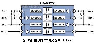 iCoupler技術(shù)實(shí)現(xiàn)的集成隔離解決方案以較低的成本降低了電路板尺寸要求和設(shè)計(jì)復(fù)雜度。圖6所示的ADuM1250和ADuM1251實(shí)現(xiàn)了真正的雙向隔離,并且集成了用于消除毛刺信號(hào)和鎖定的緩沖器。這種高度集成的解決方案僅需兩個(gè)旁路電容和兩對(duì)上拉電阻(I2C標(biāo)準(zhǔn)的規(guī)定),并且能夠以較低的成本提供I2C接口。有關(guān)這些器件的使用細(xì)節(jié),請(qǐng)參考應(yīng)用筆記AN-913“PC接口隔離”。