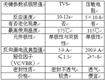 目前,國內不少需進行浪涌保護的設備上使用的是壓敏電阻。壓敏電阻是一種金屬化物變阻器。TVS比壓敏電阻的特性優越得多,具體特性參數的比較如下表所示。