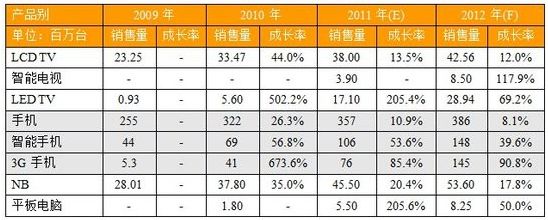 以LCD TV產業為例,近年Samsung、LG等外資廠商積極推出智能電視,海信、長虹、TCL等六大本土電視廠也加速跟進,使得中國大陸智能電視銷量將從2011年的390萬臺快速成長到2012年的850萬臺,成長率高達117.9%,滲透率也將提升至20%。此外,2012年中國大陸LED TV,預估也將交出銷售2,894萬臺、成長69.2%的佳績。