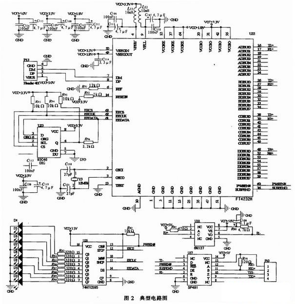 FF4232H芯片是由FIDI(Future Technology Devices International)公司生產的,專門用于USB到RS232/RS485/RS422之間的電平轉換芯片,數據收發和協議轉換工作全由芯片獨立完成,無需人工干預,不用編寫芯片的固件,給設計者帶來了極大的便利。利用該芯片只需要加少量的外圍電路就可以實現相應的轉換。
