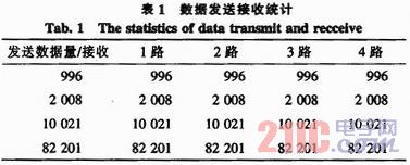 我們在測試中利用串口助手,波特率設為115 200,測試結果如圖3所示,實踐證明,使用FT4232H芯片設計出來的USB轉換器可使在串口RS422和USB口之間非常容易地建立可靠的連接。能夠同時接收來自四路RS422接口的數據,而且此四路RS422接口任何一路或者多路停止傳送數據,對其他路數的數據傳送沒有任何的影響。說明四路RS422接口相互之間是獨立工作的。同時我們也做了數據的掉包統計,如表1所示。從表1結果表明,在發送數據的過程中,并沒有出現掉包的情況,因此達到了設計要求。