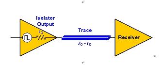 受控阻抗傳輸線是特性阻抗Z0始終受控于其幾何特性的走線。走線長度大于15mm(tr=1ns)和 30mm(tr=2ns)時,走線阻抗必須要與隔離器輸出阻抗Z0~rO匹配(如圖4所示),使信號反射最小化。這被稱為源阻抗匹配。