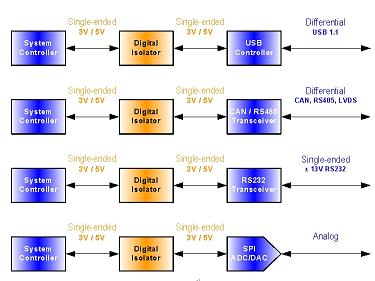 所有接口都有一個相同點,那就是數字隔離器必須安裝在隔離接口的單端3V/5V部分。
