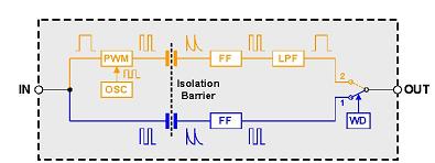 藍色部分所示路徑中處理的高速信號被電容式隔離勢壘分為多個快速瞬變脈沖群。隨后的觸發器(FF)將這些瞬態脈沖群轉換成波形和相位均與輸入信號一致的脈沖。內部看門狗(WD)檢查高速信號邊緣的周期性。在低頻輸入信號情況下,連續信號邊緣間的持續時間超出了看門狗窗口。這樣便迫使看門狗將輸出開關位置從高速路徑(位置1)改變為低速路徑(位置2)。