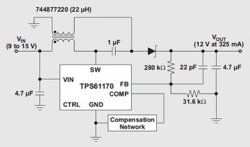 盡管DC/DC單端初級電感轉換器 (SEPIC) 拓撲不是什么新東西,但的確直到最近它才開始流行起來,然而,對于能夠對高低輸入電壓之間的輸出電壓(例如:12V未校準插墻式電源)進行調節的轉換器需求一直都存在。雖然我們可以將任何升壓轉換器/控制器配置為一個 SEPIC,但其在最近才得到普遍的使用。兩個因素促進了 SEPIC 的人氣大增:(1) IC 制造廠商已經開始制造更多具有電流模式控制功能的升壓控制器,旨在簡化補償;(2) 電感制造廠商已經開始制造許多可以最小化轉換器總 PCB 體積的單封裝耦合電感。改用耦合電感以后,許多具有兩個單獨電感應用的電源體積可以縮減三分之一。圖 1 顯示了使用TITPS61170 和Wuerth 744877220 的一個SEPIC。