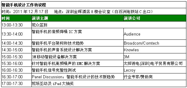 HTC、SAMSUNG、LG、SHARP、AT&T、SK Telecom、PANTECH、DoCoMo 等手機設計領軍廠商在智能市場領域的競爭非常激烈,他們都用到哪些技術?由我愛方案網(www.52solution.com)、電子元件技術網(www.sz-bosch.com)和China Outlook Consulting主辦的首屆智能手機設計工作坊(Smart Phone Design Workshop)將于2011年12月17日下午在深圳金暉酒店8樓會議室隆重召開!為您Hold 住 2012 智能趨勢,給力手機開發設計!