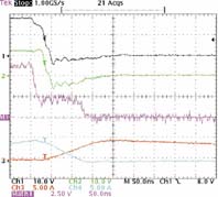圖2中CH1是高端 (HS) MOSFET M1的柵極-接地處電壓。Ch2是同圖中HS MOSFET M1的源極-接地處電壓。圖2中M1跡線Ch1-Ch2的計算值,表示HS MOSFET的柵-源電壓。Ch3和Ch4分別是M2和M1的漏電流。