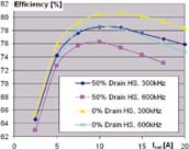 - 在600kHz,12.5A條件下, 漏極電感的50%比0%的效率將減少8.5%。由于MOSFET溫度過高,12.5A以上便無法進行試驗。