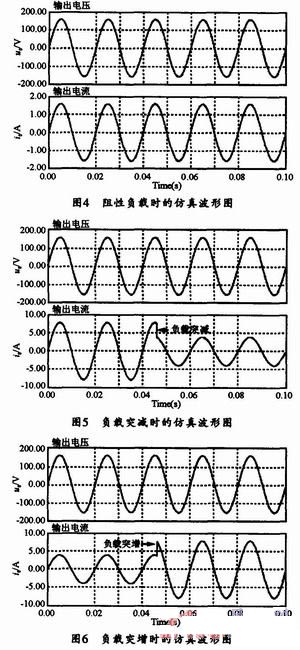 圖4給出了在輸入電壓為200V,額定負(fù)載分別為ZL=100Ω時(shí)的輸出電壓和輸出電流仿真波形;由圖4可見,輸出電壓頻率均能穩(wěn)定在50H z;圖5所示為負(fù)載突減時(shí)的仿真波形,其中突變部分是負(fù)載ZL=20Ω切換到ZL=40Ω時(shí)的輸出電壓、電流仿真波形;圖6為負(fù)載突增時(shí)的仿真波形,其中突變部分是負(fù)載ZL=40Ω切換到ZL=20Ω時(shí)的輸出電壓、電流仿真波形;通過以上仿真波形圖可知,該系統(tǒng)工作穩(wěn)定,靜態(tài)誤差小,并具有很強(qiáng)的魯棒型,同時(shí),這種電流內(nèi)環(huán)電壓外環(huán)的雙閉環(huán)控制的動(dòng)態(tài)響應(yīng)速度非常快,因此可見,用該方法對(duì)該系統(tǒng)控制電路進(jìn)行設(shè)計(jì)是有效而可行的。