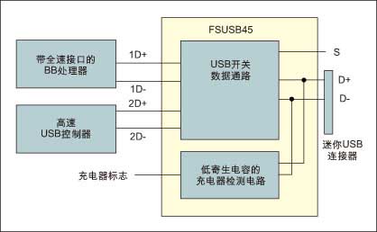 在這些應(yīng)用中,為實(shí)現(xiàn)充電器檢測(cè)和全速USB控制器輸出電容的隔離,需要帶超低內(nèi)部電容檢測(cè)電路的USB開(kāi)關(guān)。同時(shí),用來(lái)決定選擇哪條USB通道作為輸出的USB通道選擇腳(圖2中的S腳)必須能識(shí)別1.8 V 和3 V邏輯輸入(注意:在基帶處理器GPIO輸出中1.8 V 和3 V都相當(dāng)常用)。