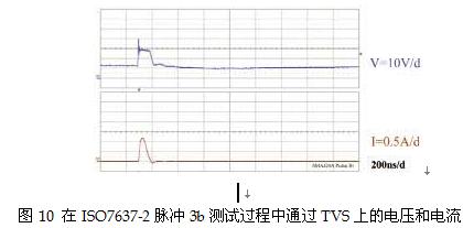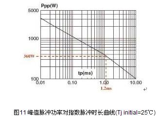 以SMAJ24A為例,從產(chǎn)品數(shù)據(jù)表摘取這些參數(shù)與圖11的曲線進(jìn)行比較,發(fā)現(xiàn)SMAJ24A符合ISO7637-2脈沖2測試的要求,可承受長達(dá)1.2ms的360 W指數(shù)脈沖,這個數(shù)值遠(yuǎn)遠(yuǎn)高于ISO7637-2脈沖2電涌強(qiáng)制的4μs時長。