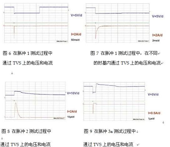 當(dāng)承受圖1中的1、2、3a和3b的脈沖時,該保護(hù)電路的特性如圖6、圖7、圖8、圖9和圖10所示。