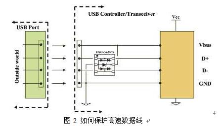 這個辦法的實質(zhì)是在USB接口附近連接一個保護(hù)元器件。它由幾支采用軌對軌結(jié)構(gòu)的二極管組成,本身具有低電容的特性。內(nèi)部鉗位器件為兩條數(shù)據(jù)線提供±25kV ESD (ISO10605)保護(hù)功能,以及為Vbus電源線提供保護(hù)功能。