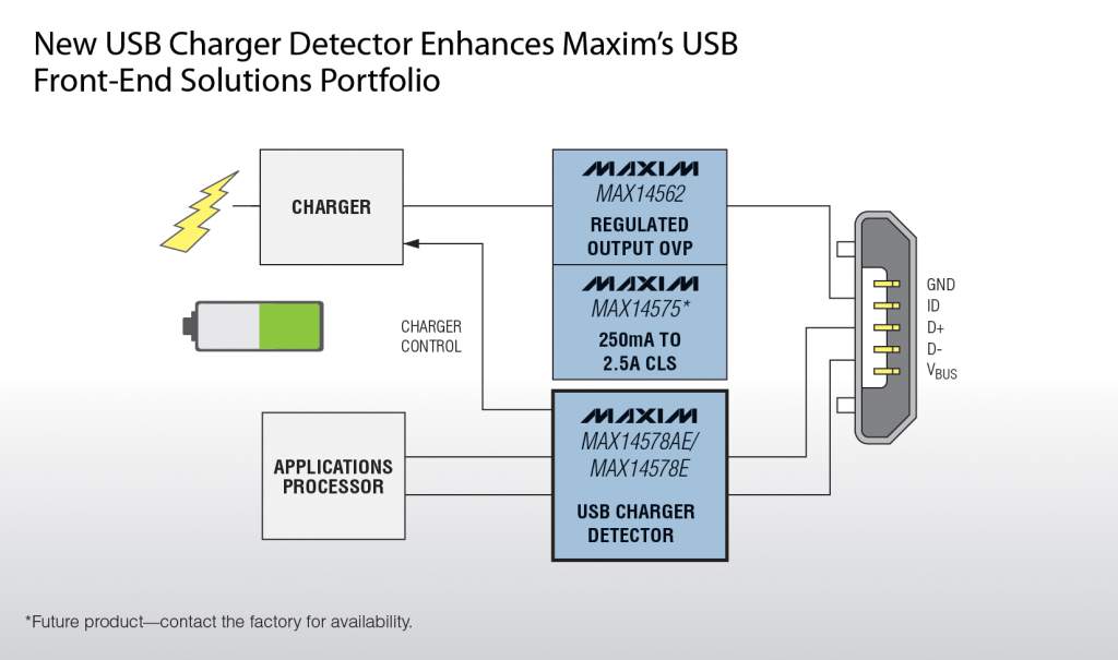 MAX14578E/MAX14578AE支持各種類型的USB充電器,為用戶提供“完全通用”的充電支持。現在,制造商在交付設備時可以不提供電源適配器,由此簡化其生產供應鏈、提高環保資質。