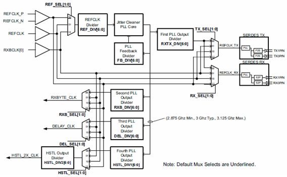 SERDES實現的一個關鍵技術是時鐘的產生和分布,圖5是TLK3132芯片內部的時鐘架構。時鐘配置非常靈活,支持單端或差分參考時鐘輸入,同時包括多個高頻鎖相環電路: