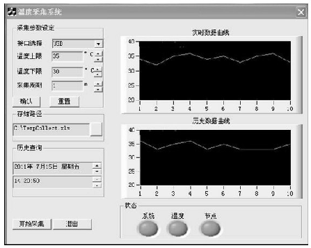 采用CC2531作為溫度數據的匯聚節點,采用IEEE 802.15.4協議組成一個由10個采集終端組成的星狀網絡,對終端節點的溫度進行采集。終端節點硬件由CC2530實現,溫度傳感器采用DS18B20.上位機由Visual C++編寫,實現數據的實時顯示,并實現數據的存儲和歷史溫度查詢。CC2531的USB設備描述符里聲明PID=0x1000,VID=0x0451,UBS驅動采用Windows XP系統提供的usbser.sys.溫度采集結果如圖5所示。