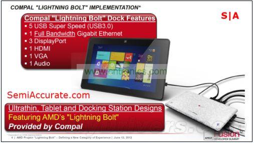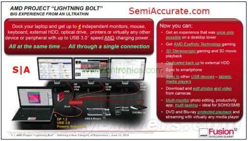 從硬件層面上看,Lightning Bolt其實(shí)很簡單,驅(qū)動(dòng)級的硬件兼容性使得芯片上的USB通道及APU上的DP通道用一條線纜就可以連接起來并輸出到hub上。