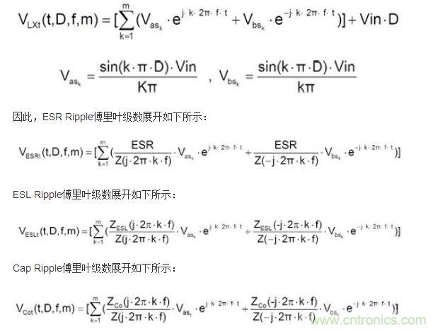 基于此因素,本文將以傅里葉函數(Fourier Series Expansion)方式來探討同步交換式降壓轉換器(Synchronous Step Down Converter)輸出電壓紋波的波形,并依電容完整等效串聯電阻(ESR)、等效串聯電感(ESL)、電容值(Capacitance)對應的公式,經由理論推導,有效地分析電源模塊輸出端紋波成分。