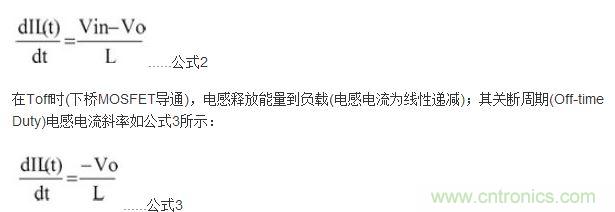 電感電流函數IL(t)可由公式2求得,其波形如圖2所示。在Ton時(上橋MOSFET導通),輸入電源VCC供應能量到負載端且電感組件儲存磁能(電感電流為線性遞增),依據法拉第定律(Faraday''s Law):