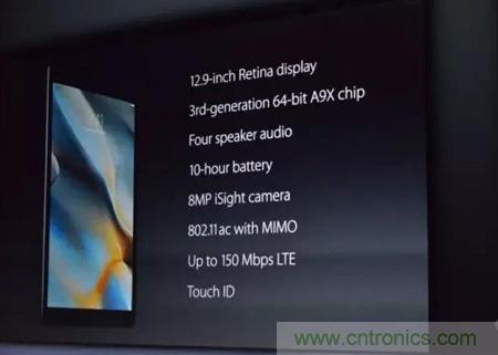 iPad Pro采用了12.9存屏幕,寬度和iPad Air的長度一樣,分辨率高達(dá)2,732*2,048,擁有560萬像素,比MacBook Pro還要高。后置800萬像素?cái)z像頭。iPad Pro搭載A9X處理器,擁有了桌面級的處理器性能,速度是A8處理器的1.8倍,內(nèi)存帶寬是A8X的2倍。同時(shí)在機(jī)身四周配置四個(gè)揚(yáng)聲器,是iPad Air 2音量的三倍。蘋果聲稱iPad Pro比80%的筆記本電腦的處理速度都要快。新款iPad Pro的CPU處理能力是初級iPad 22倍,圖形處理能力是初級360倍。