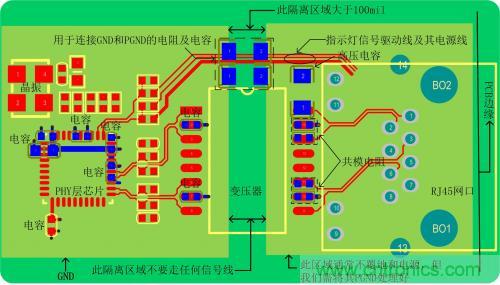 e)變壓器的兩邊需要割地:即RJ45連接座和變壓器的次級線圈用單獨的隔離地,隔離區(qū)域100mil以上,且在這個隔離區(qū)域下沒有電源和地層存在。這樣做分割處理,就是為了達(dá)到初、次級的隔離,控制源端的干擾通過參考平面耦合到次級;