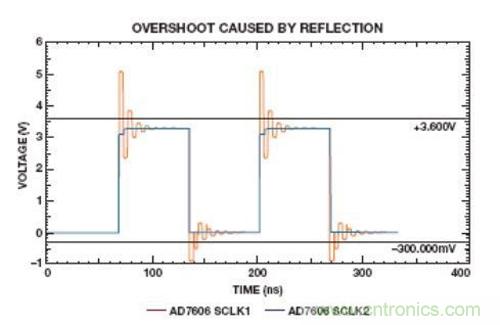 在圖8中,SCLK1上的大過沖違反了–0.3 V至+3.6 V的絕對最大額定值。串聯電阻可減小SCLK2上的壓擺率,使信號處于額定值之內。