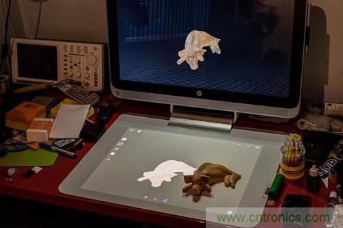 屏幕支架上方的是包含掃描儀相機(jī)的投影儀,允許在 Touch Mat 上盡可能直觀的使用。盡管 Touch Mit 本身并非觸控屏幕,但通過(guò)這些設(shè)備的交互能夠投影圖片并進(jìn)行相應(yīng)的觸控交互。Sprout Pro 正面裝備了支持 3D 眼鏡的 23.6 英寸 Zvr顯示器,同時(shí)支持虛擬現(xiàn)實(shí)和增強(qiáng)現(xiàn)實(shí)。