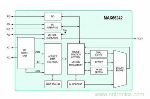 幾種功能對于無線NFC/RFID應(yīng)用非常重要:集成到無源標(biāo)簽認(rèn)證器的高級安全性(圖2)、集成無線NFC/RFID接口和I?C接口、數(shù)據(jù)保護(hù)模式、高速數(shù)據(jù)傳輸、標(biāo)簽?zāi)芰渴占籑AX66242集成了SHA-256加密引擎,提供基于安全密鑰的對稱式質(zhì)詢-應(yīng)答安全認(rèn)證。是控制NFC/RFID讀卡器與那些設(shè)備通信,以及如何與MAX66242通信的最好途徑。32字節(jié)SRAM緩存器有利于通過I?C接口進(jìn)行高速數(shù)據(jù)傳輸。標(biāo)簽上的能量收集引腳VOUT使其利用天線從讀卡器的HF場收集能量。