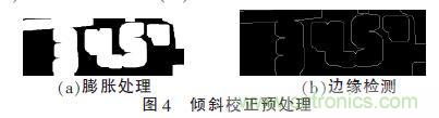 對于液晶屏圖像,考慮采用霍夫變換的方法求其傾斜角。通過霍夫變換,可以取得圖像中所有直線的端點。為了便于快速、高效地求取圖像的傾斜角,先對圖像進行膨脹處理和邊緣檢測。