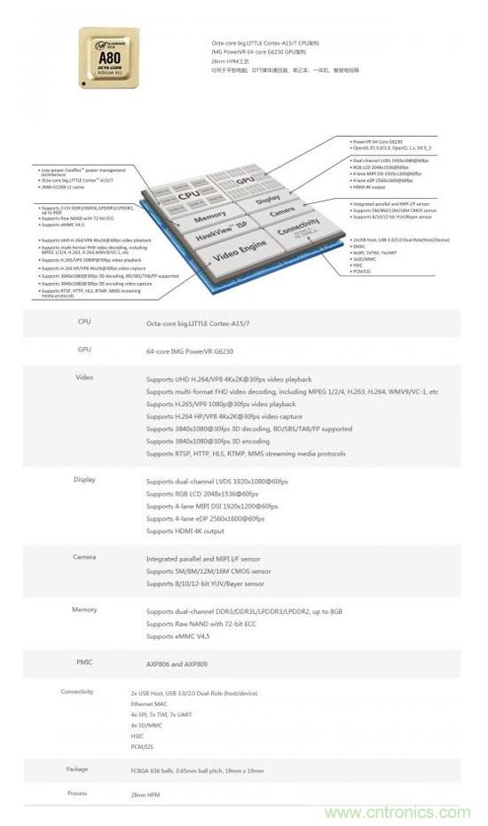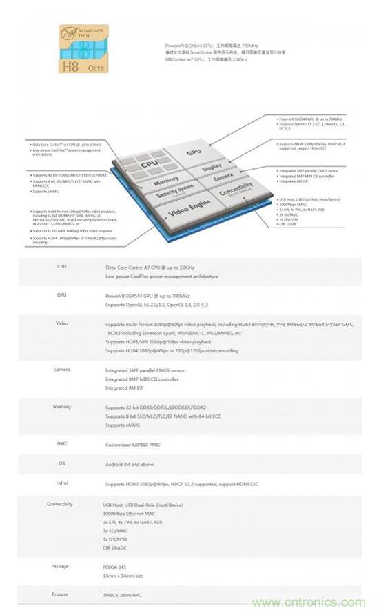 多媒體方面, H8支持多格式1080p@60fps視頻編解碼, 支持H.265/HEVC視頻處理,集成8M ISP圖像信號處理架構,可支持800萬像素攝像頭。 顯示方面,H8支持HDMI 1080p@60fps顯示,支持HDCP V1.2協議,支持HDMI CEC。此外,H8集成了全志新一代麗色顯示技術,圖像顯示質量進一步提升。事實上,H8芯片最早是應用于電視盒子。
