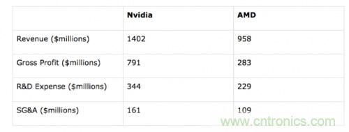 另一個(gè)重要的優(yōu)勢是,Nvidia公司的財(cái)務(wù)實(shí)力在恢復(fù)。目前Nvidia是盈利的,并有望在研發(fā)中比AMD投入更多的的資金,而此前則不得不削減營運(yùn)費(fèi)用。下面的表格提供了兩家公司最新一個(gè)季度的財(cái)務(wù)狀況比較: