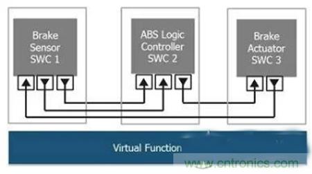 將設計與硬件決策分開使車輛生產商/OEM能夠依據所需的車輛功能進行自上而下的設計。存在于這個設計時間的虛擬功能總線(VFB)概念讓所有軟件電子控制單元都能夠實現互連和獲得測試。這讓設計人員可專注于應用層,而不是根本的軟件基礎建設。通過采用虛擬功能總線,應用軟件組件(SWC)與其它應用軟件組件也相互獨立。軟件組件向虛擬功能總線發出輸出信號,虛擬功能總線再將信息傳送給目標組件的輸入埠。AUTOSAR定義了輸入和輸出端口,以及交換信息的格式。這種抽離式的(abstracted)方法使得在定義相關硬件之前可實現所有車輛軟件功能和接口交互驗證。設計調整也因此變得容易得多,同時所有功能都被定義成虛擬功能總線上的軟件組件(圖2)。