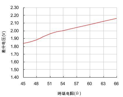 在負載電阻由45Ω不斷增大到66Ω時,節(jié)點的輸出差分電壓也隨著由1.84V增大到2.16V,兩者近似線性關系。為了使發(fā)送節(jié)點的輸出差分電壓不至于過低,實際組網時負載電阻應在圖 1測試的范圍內波動。我們分析RL的組成有3個:終端電阻、總線節(jié)點的差分輸入電阻、總線本身的有效電阻。 終端電阻:總線兩端均需要增加終端電阻,當總線距離長時,總線有效電阻大,損耗大,可以適當增加終端電阻值以減小總線有效電阻的損耗,如150Ω~300Ω。