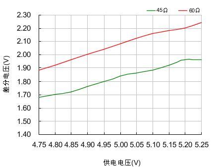 差分電壓除負載電阻的影響外,還會受到供電電壓的影響,如圖 2我們測試了CTM1051M模塊在不同電壓,不同負載下的差分電壓幅值,可以看到電源電壓升高0.5V,差分電壓幅值會升高約0.3V。