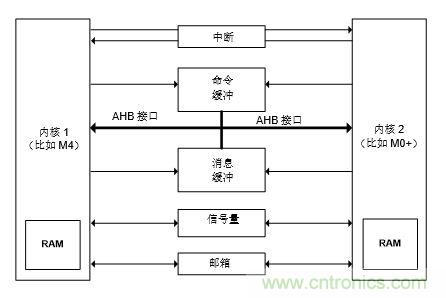 消息隊(duì)列:消息隊(duì)列使用共享內(nèi)存的兩個(gè)區(qū)域來(lái)存儲(chǔ)每個(gè)核心發(fā)送給另一個(gè)核心的消息。第一個(gè)區(qū)域是被稱為命令緩沖器的專用存儲(chǔ)器,用于存儲(chǔ)從主機(jī)發(fā)送到從機(jī)的命令。另一個(gè)專用存儲(chǔ)器被稱為消息緩沖器,它使從機(jī)能夠響應(yīng)主機(jī)。