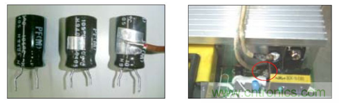 B.當電路板上電容所在的位置周圍有發熱器件(如功率管,散熱片等)時, 將溫度感應探測端接于電容靠近發熱源的側面鋁殼上,將對著發熱源的鋁殼表面膠管剝掉一小塊,用點溫膠直接粘連(或利用熱傳導率高的銀膠帶連接,用酒精等東西擦式表面后貼上銀色膠帶),溫度感應探測線另一端連接點溫機,如下圖: