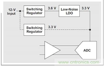 極大降低系統(tǒng)功耗的一種方法是對高速數(shù)據(jù)轉(zhuǎn)換器的電源進(jìn)行優(yōu)化。數(shù)據(jù)轉(zhuǎn)換器 設(shè)計和工藝技術(shù)的一些最新進(jìn)展,讓許多新型 ADC 可以直接由開關(guān)電源來驅(qū) 動,從而達(dá)到最大化功效的目的。 系統(tǒng)設(shè)計人員們習(xí)慣在開關(guān)穩(wěn)壓器和 ADC 之間使用一些低噪、低壓降穩(wěn)壓器 (LDO),以清除輸出噪聲和開關(guān)頻率諧波(請參見圖 1)。但是,這種干凈的電 源設(shè)計的代價是高功耗,因為 LDO 要求壓降余量來維持正常的運(yùn)行。最低壓降 一般為 200 到 500mV,但在一些系統(tǒng)中其可以高達(dá) 1 到 2V(例如,ADC 的3.3-V 電壓軌產(chǎn)生自一個使用 LDO 的 5V 開關(guān)電源時)。