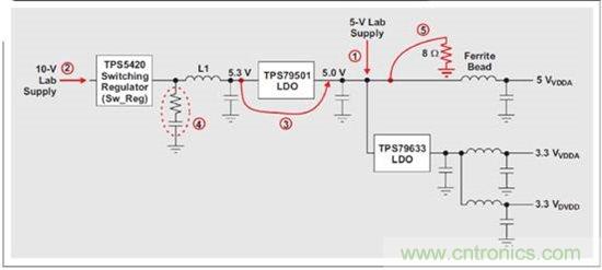 實驗 2—將一個 10-V 實驗室電源連接到 TPS5420 降壓穩(wěn)壓器,其使用一個5.3-V 輸出。這樣可為 TPS79501 提供一個 300-mV 壓降,從而生成一個 5-V電壓軌。