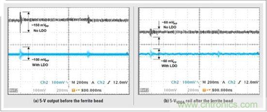 實驗 3—使用 TPS5420,從 10-V 實驗室電源生成一個 5-V 電壓軌。本實驗中, 我們繞過了 TPS79501 低噪聲 LDO。圖 3a 表明,如“實驗 2”連接的 LDO 較 好地減少了開關(guān)穩(wěn)壓器的 5.3-V 輸出峰值電壓。但是,圖 3b 表明 5-VVDDA 電壓軌鐵氧體磁珠之后輸出沒有巨大的差異。
