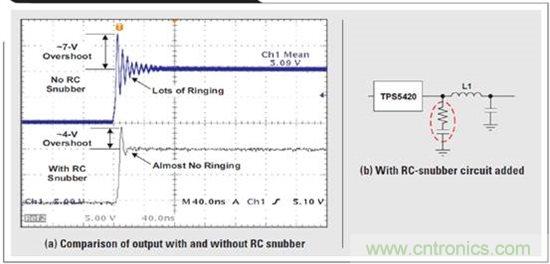 RC 緩沖器 降壓穩(wěn)壓器輸出能夠以相當(dāng)高的開關(guān)速度對非常大的電壓實施開關(guān)操作。本文 中,將 TPS5420 的輸入電壓軌設(shè)定為 10V,我們可以在輸出端觀測到許多過沖 和振鈴,如圖 7a 所示。為了吸收一些電源電路電抗能量,我們將 RC 緩沖電 路添加到了 TPS5420 的輸出(請參見圖 7b)。